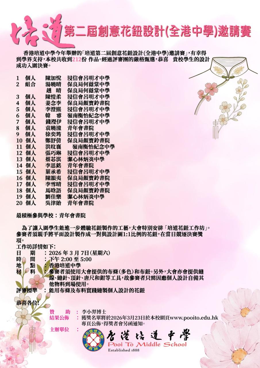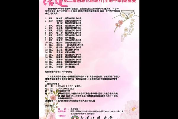 Pooi To Middle School is honored to have received 212 submissions for this year's "Pooi To Flower Button Design Second Competition (Secondary Section) ," thanks to the support of the academic community. Please refer to the attachment for the shortlist.