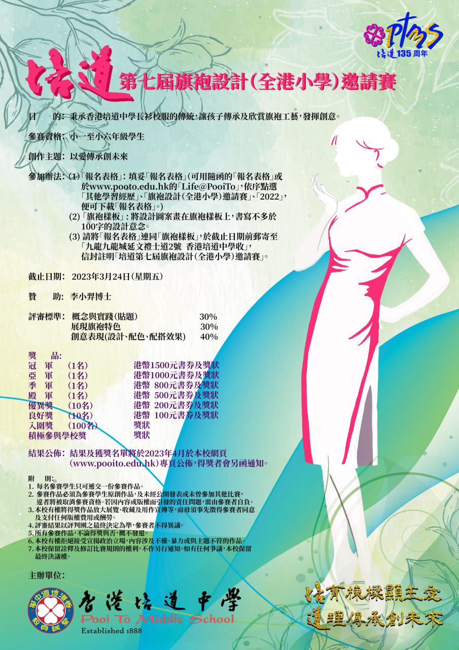 The prize presentation of The Seventh "Pooi To Qipao Design (Primary Section) Competition" was successfully held on Saturday. It was amazing to see that their impressive designs maintained a good balance between the tradition of Qipao, aesthetics and this year’s school theme ‘Spreading love for the future’. We thank you for your continued support to Pooi To. See you next year.