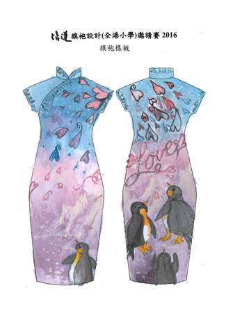 | 作品意念: 我的旗袍設計概念源於企鵝,以中國畫繪畫西方題材。選擇企鵝為主題,比較特別,有別於傳統大紅大紫的牡丹花。我本身十分喜歡企鵝,所以以此為主題。旗袍前面:一隻企鵝在雪地裡找尋愛(親情);背面:憑意志、堅持、心存愛終於找到和同伴快樂上路。顏色用了很多柔和協調的淺藍至淺紫色,令整件旗袍很優雅。還有些「心」「心」由上而下斜斜向下灑,充滿愛。旗袍背刻意繡了「LOVE」字,中西合壁。為了更高貴,我於領、手袖邊及盤扣位都繡有藍白色水晶閃石,既高貴又不太搶視線。 | 作品意念: 旗袍以星星為主題,代表女性的光芒,而女子則作襯托,使主題更為突出。 | 作品意念: 這旗袍的名字叫「柔」,概念源自鯉魚在水裡自由暢泳的姿態,就好像一位女性穿起旗袍後,展現嬌柔的一面,婀娜多姿的體態。 |