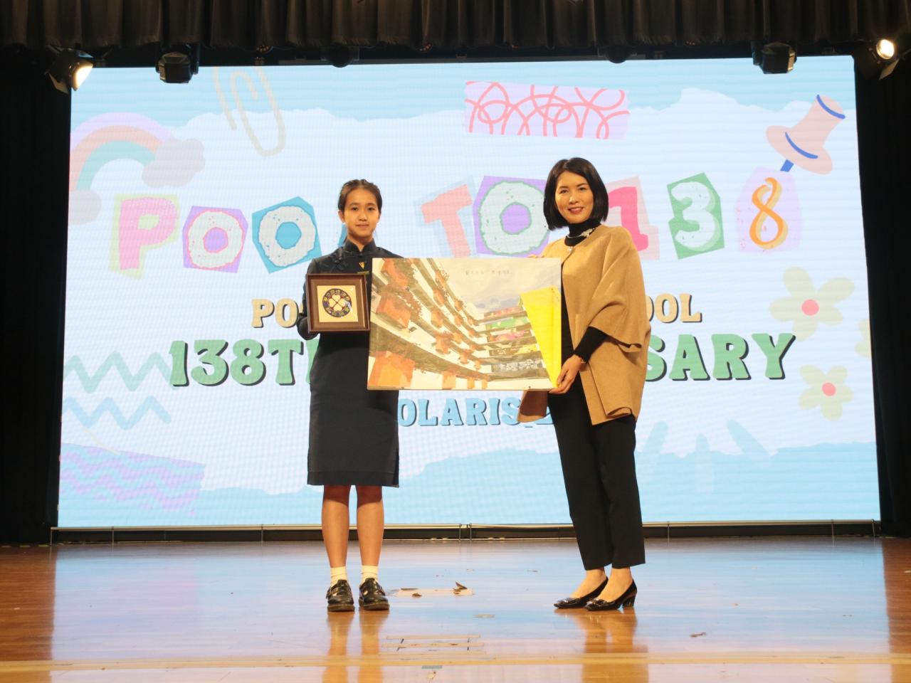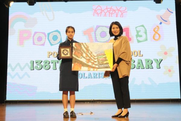 Today marks the celebration of the 138th anniversary of Pooi To's founding. During the morning assembly, the Student Union joined teachers and students in reflecting on the past year's journey of school enhancements and various activities, and presented a hand-painted illustration of the school campus along with a woven school badge as a heartfelt gift to the school.