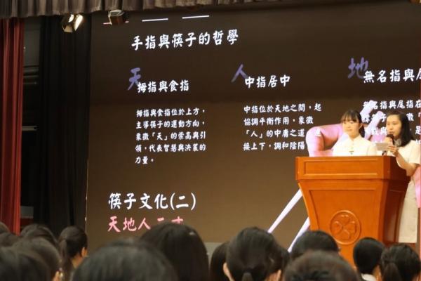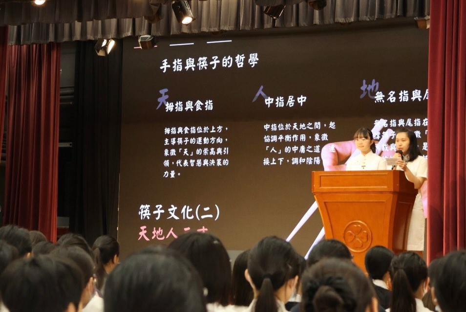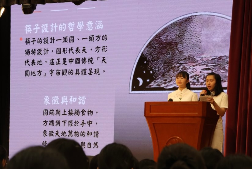 During the morning assembly, students presented on the theme ‘Chopstick Culture.’ Through a short video and a slideshow, they introduced the history, etiquette, and philosophy of chopsticks, helping everyone understand the Chinese wisdom and emotions carried by this pair of utensils, and encouraging reflection on how to cherish and pass down traditional culture in daily life.